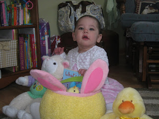 And while I dragged us all, over-dressed baby in tow, to Easter morning mass, I was giddy with excitement to get back home and have Buttercup play with the Easter basket I decked out for her with books and stuffed animals.