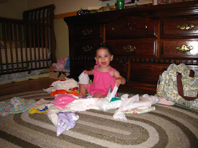 A recent WAHM-O moment found Buttercup playing with her clothes and emptrying out the baby wipes package. Note that I got concerned because she was being quiet while I was working....